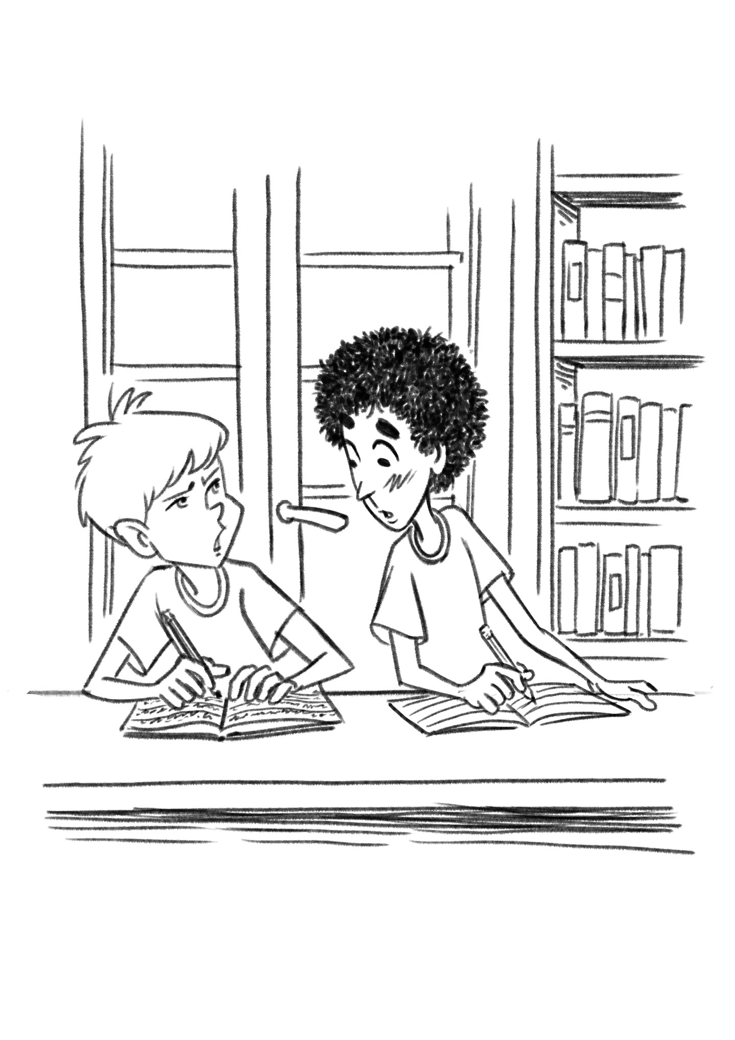 קמתי והתגנבתי אל מאחורי הגב של ניר. עמדתי על קצות האצבעות והצצתי. הצלחתי לפענח משפטים אחדים. מבצע קשה מאוד, כי לניר יש כתב יד זעיר.