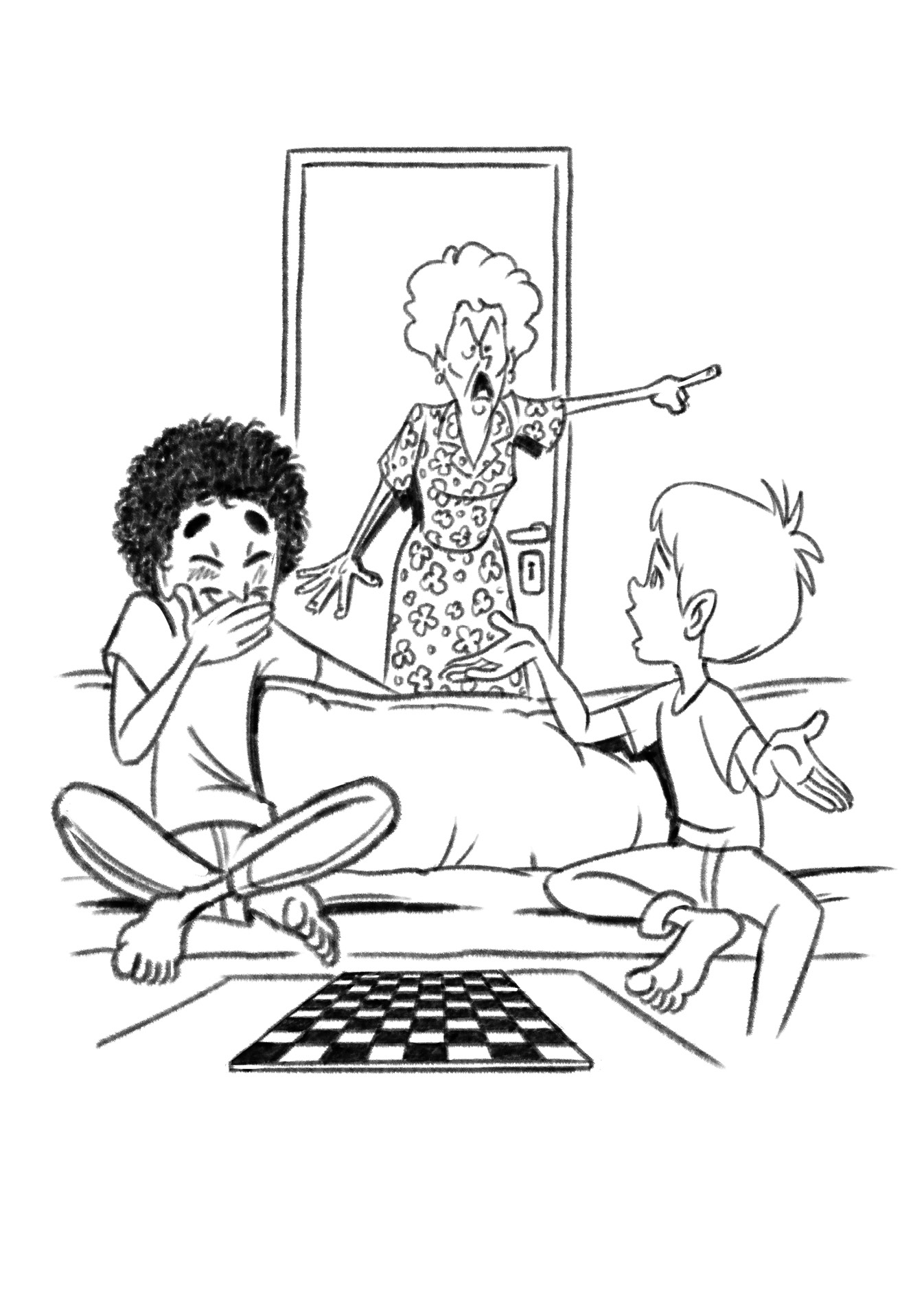 ניר ואני שיחקנו שח כדי להעביר את הזמן מהר, אבל ניר היה מבולבל לגמרי והפסיד פעמיים. כשניר מפסיד פעמיים, הוא בדרך כלל מתעצבן וממציא כל מיני תירוצים להפסיק לשחק, אבל הפעם הוא היה כל כך מבולבל עד שהוא אפילו שכח להמציא תירוצים, ופשוט אמר, "אני הולך לכתוב ביומן."