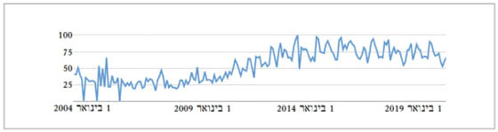 איור 1. היקף החיפוש אחר המושג Digital Humanities במנוע החיפוש של גוגל בין השנים 2004־2020 בעולם כולו. התרשים מראה עלייה חדה יחסית בין השנים 2009־2014, ומגמת התייצבות (ואפילו ירידה מתונה מאוד) משנת 2014 ואילך. את שאלת היחס בין ממצאי התרשים לבין הטענה המופיעה בעמודים אלה נותיר לפי שעה ללא מענה.10