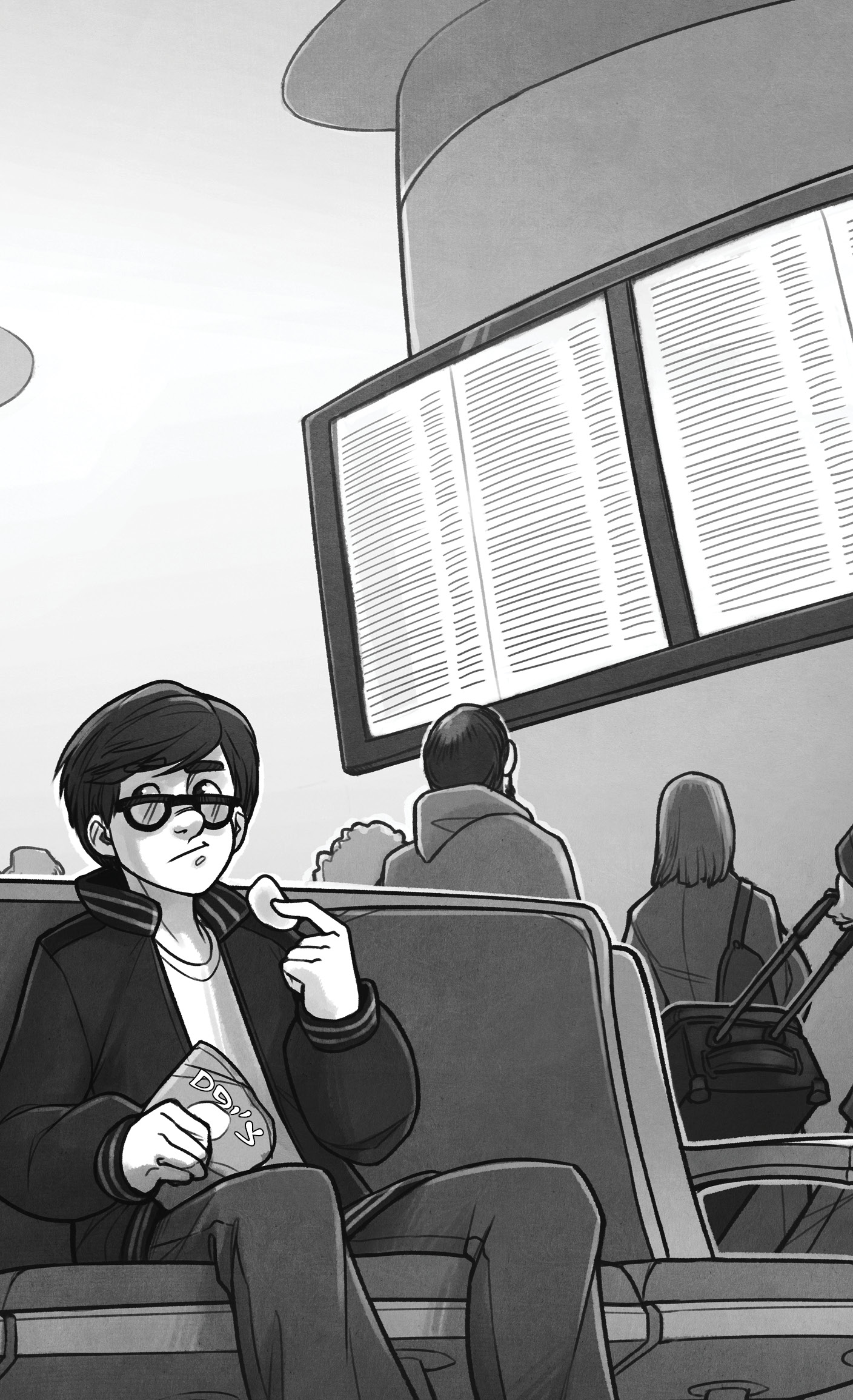 אכלתי עוד צ'יפס. סבא סמדרי היה אמור ליצור איתי קשר באמצעות עדשות השליח כבר לפני יותר משעתיים. התחיל להיות מאוחר, אפילו בסטנדרטים שלו. הסתכלתי סביבי בחיפוש אחר סוכני ספרנים בקרב הקהל בשדה התעופה.