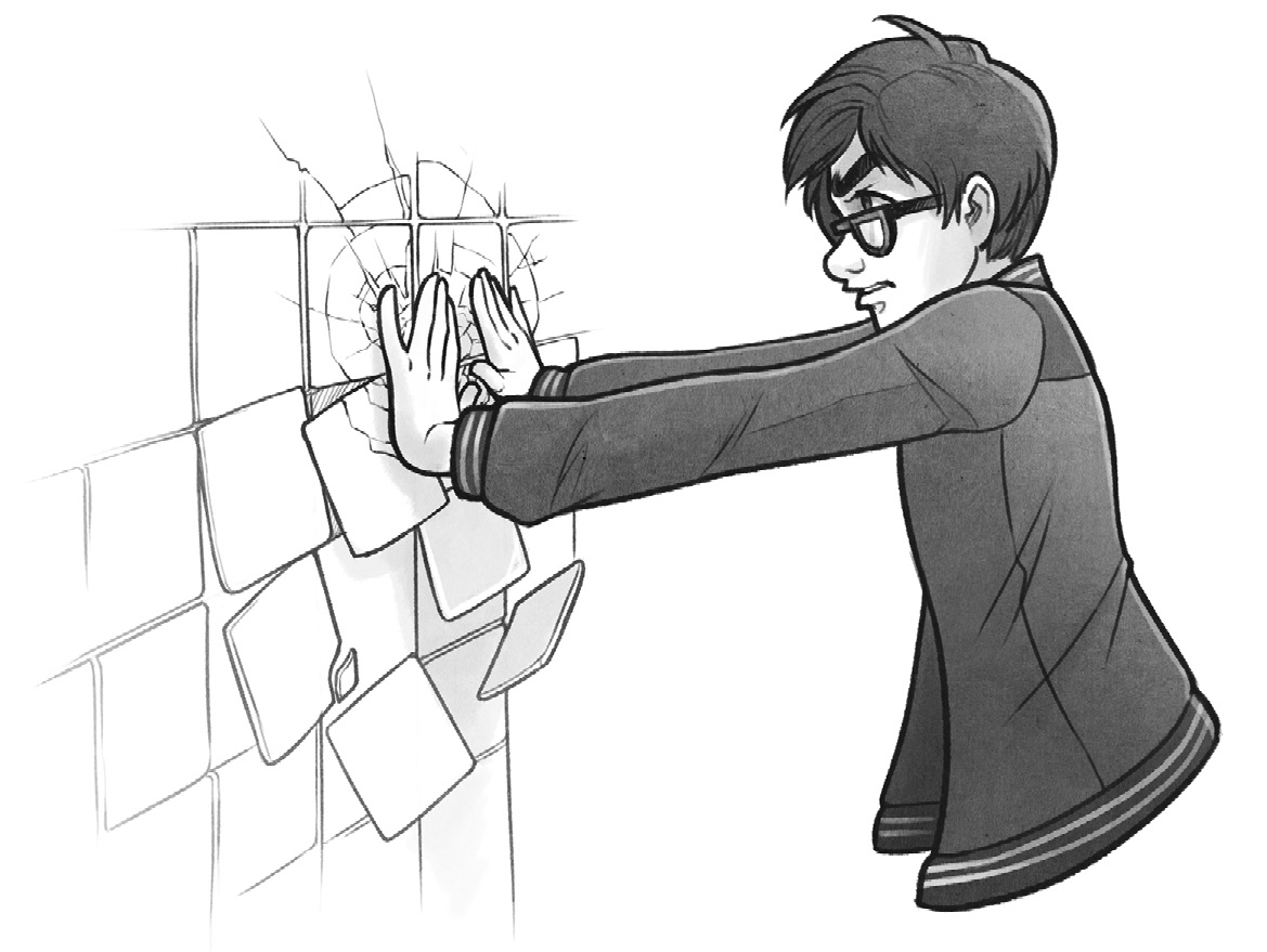 התמקדתי, ופרצי אנרגיה תאומים פעמו מחזי ולאורך זרועותיי. האריחים שמולי ניתקו ממקומם והתנפצו כשפגעו ברצפה, כמו שורת נטיפי קרח שצנחו ממעקה. המשכתי להתרכז. אנשים מאחוריי זעקו. הספרנים יהיו פה בכל רגע.