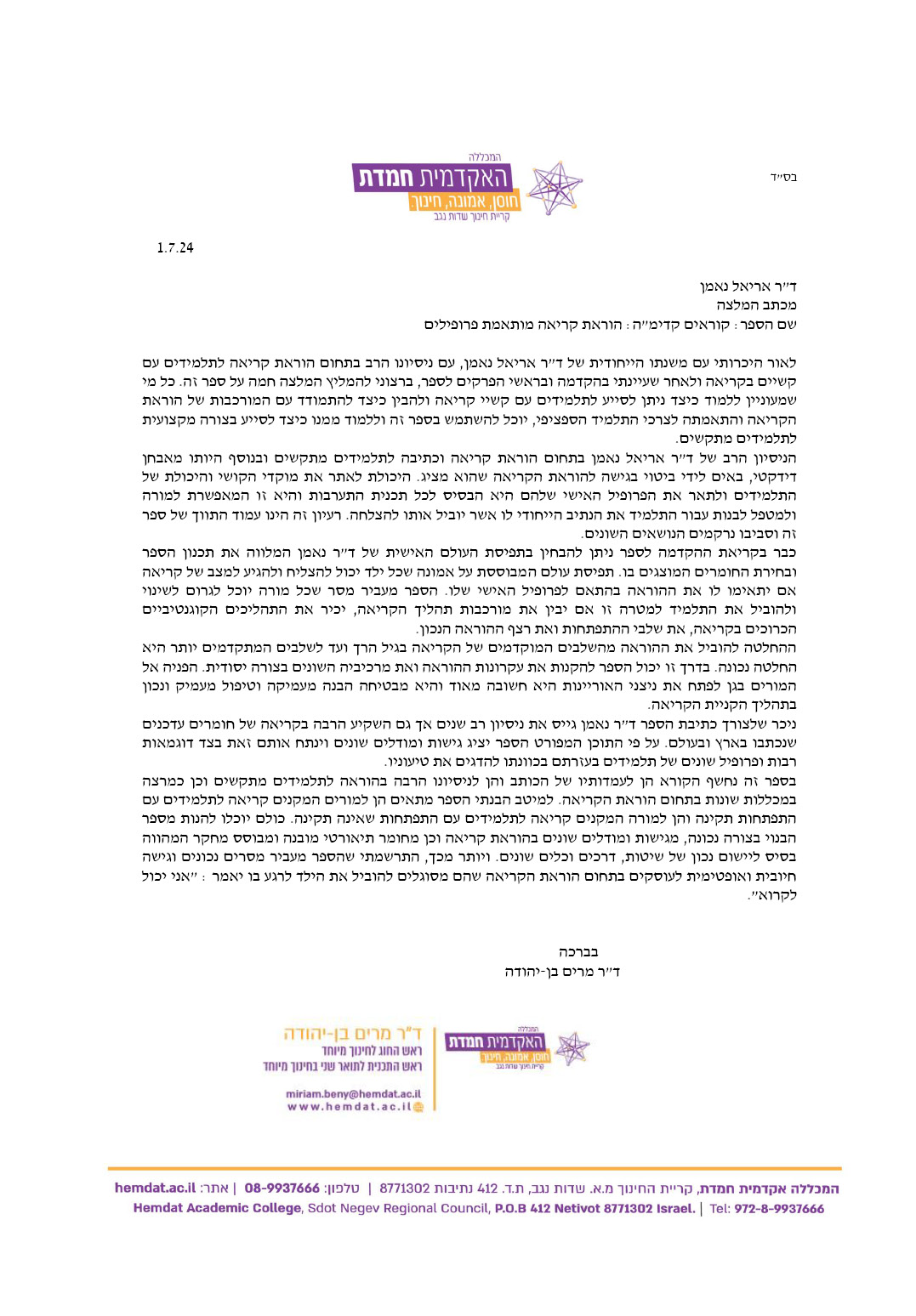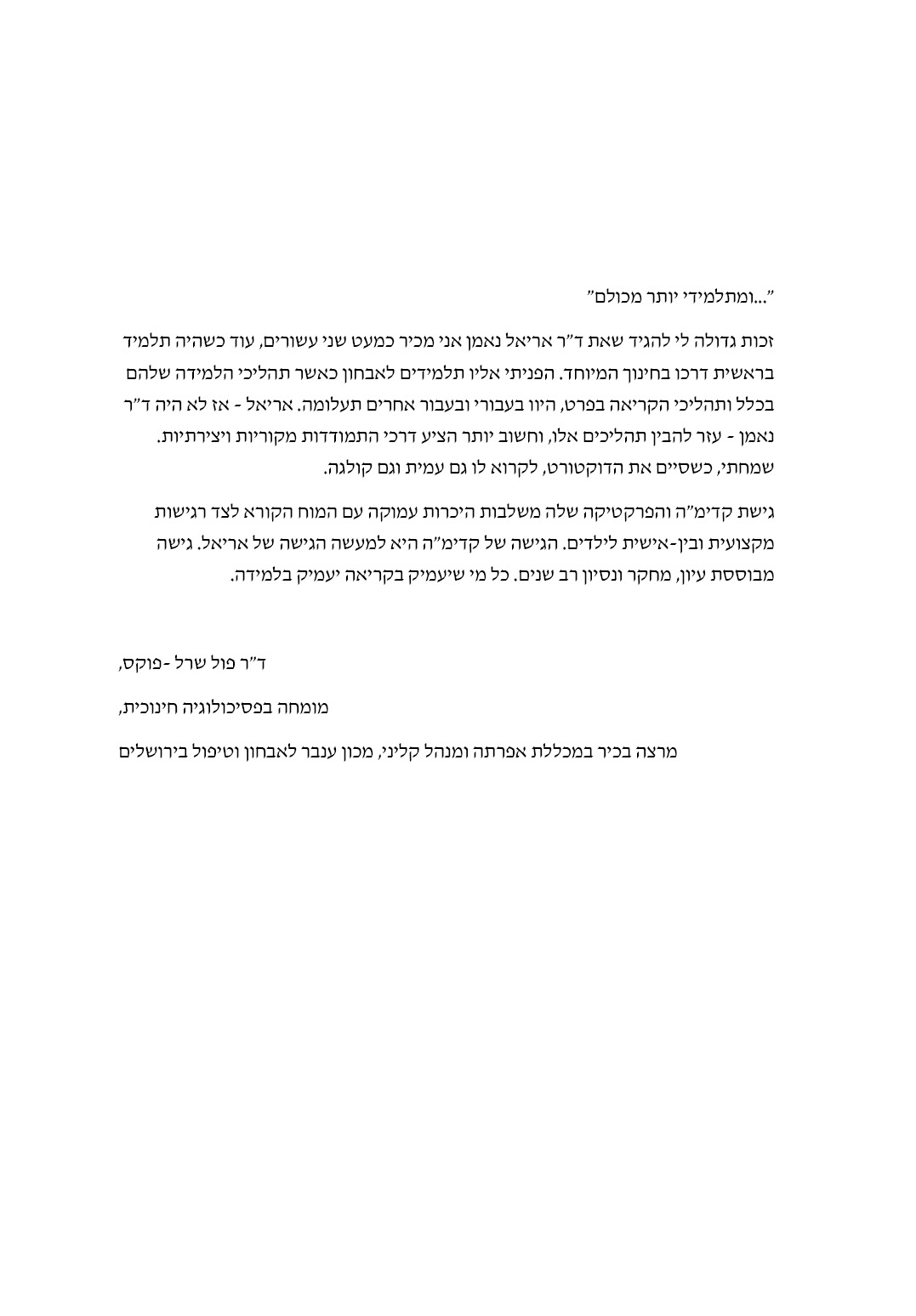 ביטויים כגון "ניסיתי ללמדו בכל שיטות הקריאה אך ללא הועיל," אותם שמעתי מדי פעם ממורים בעלי רצון טוב ואמיתי לקדם את הילד, מבהירים כי המורה זקוק לכלים נוספים ול"מפה" פנימית של תהליך הקריאה והמנגנונים הפסיכולוגיים המאפיינים קוראים שונים. הבנה מעמיקה של ה"מפה" הפנימית הספציפית בנוסף להיכרות עם מנגנוני הקריאה שיוצגו בספר יהפכו את המורה לדינמי, גמיש ובעל ידע רחב שיאפשרו, לו ולילד, לצעוד ביחד במסלול ליניארי של התקדמות.