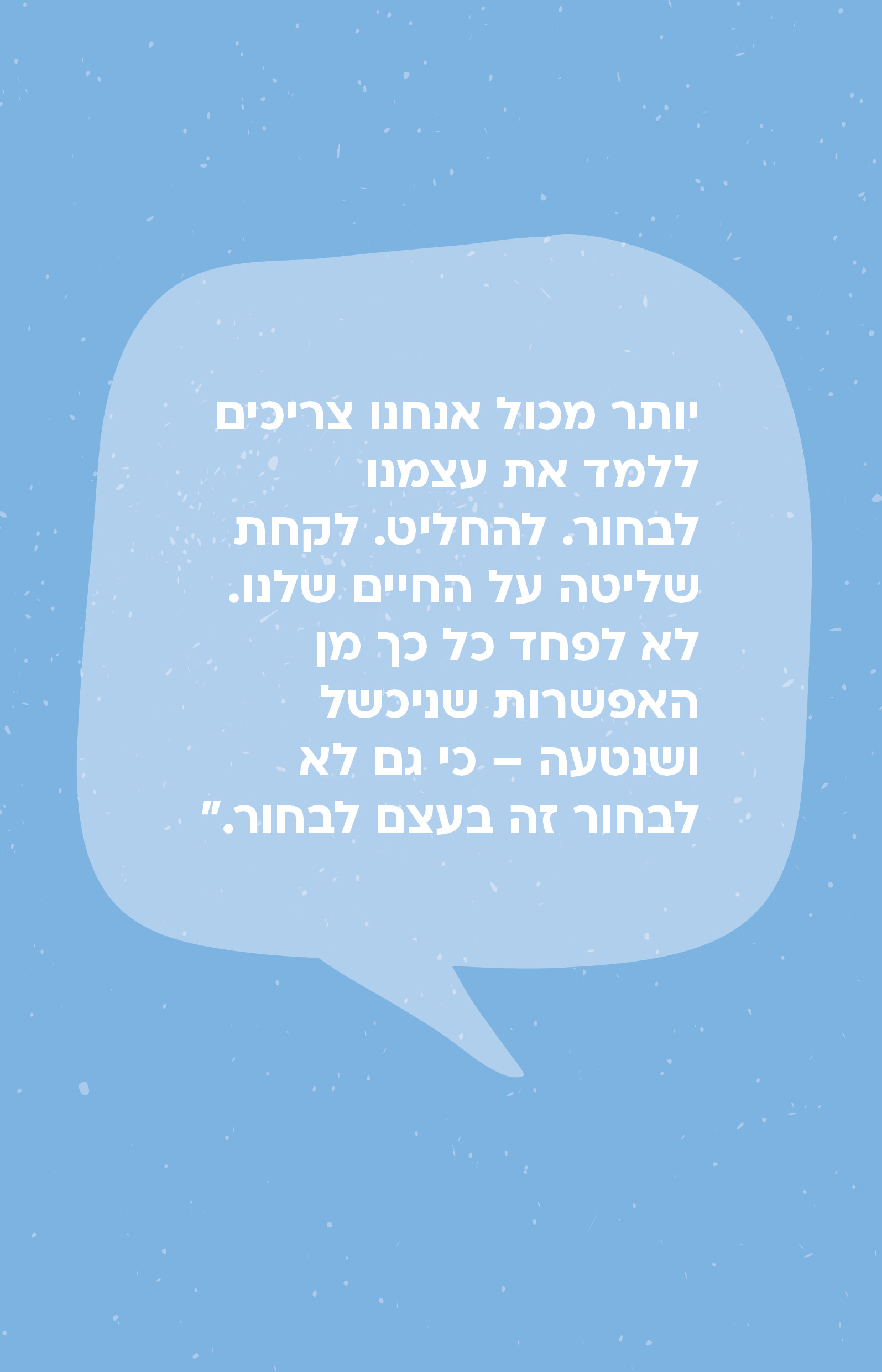 אבל זה לא מספיק. יש הרבה יותר מדי ברירות מחדל שהעולם בוחר בשבילנו, ולא תמיד לטובתנו. מידות של בגדים; מינונים של מלח וסוכר במאכלים; יחס בין זמני לימודים או עבודה לבין פנאי ומשפחה. ולכן יותר מכול אנחנו צריכים ללמד את עצמנו לבחור. להחליט. לקחת שליטה על החיים שלנו. לא לפחד כל כך מן האפשרות שניכשל ושנטעה — כי גם לא לבחור זה בעצם לבחור. לא לבחור בסינון של האינטרנט זה בדיוק כמו לבחור שהוא יהיה פרוץ; להשאיר בטלפון אפליקציה שמכלה את חיינו לריק, זה בדיוק כמו להתקין אותה בכל יום מחדש.