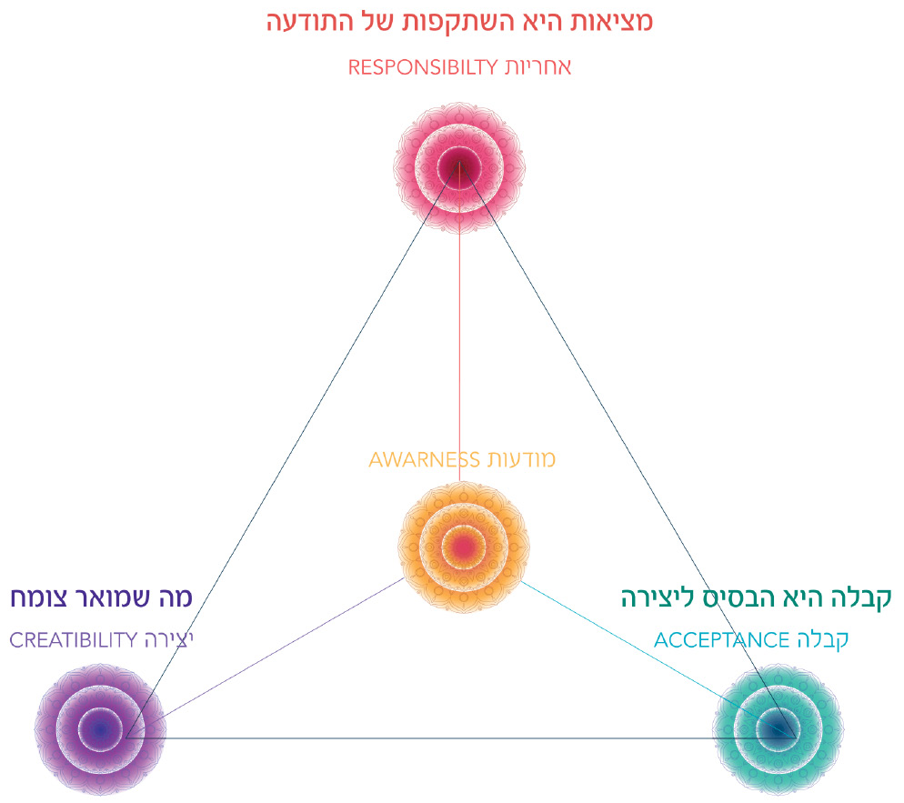 ההבנה שמציאות היא השתקפות התודעה סוללת את דרכנו להכרת התודעה, ובמיוחד למערכת ההפעלה הריאקטיבית ולאפשרות להשתחרר מהתניות שאחזו בנו שנים רבות. היישום של מה שמואר צומח מאפשר לנו להתחבר לתודעה הקריאטיבית ולהתמקד ביצירה מודעת ומכוונת. והקסם? הקסם נוצר כשקבלה הופכת לאיכות הבסיסית של חיינו ומחברת בין כל החלקים.