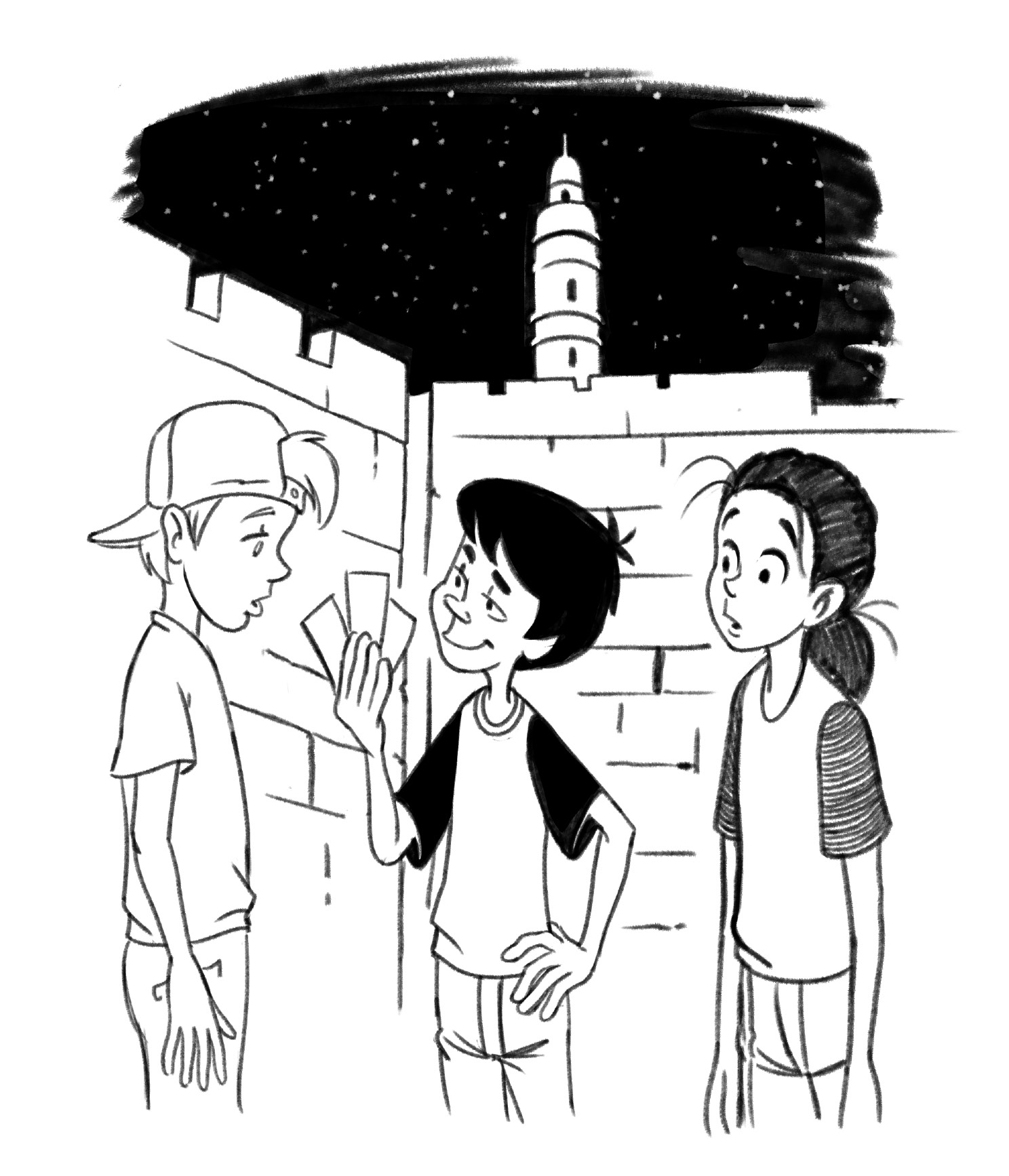 יֶלֶד אַחֵר, אַמִּיץ יוֹתֵר מִמֶּנִּי, אוּלַי הָיָה נִכְנָס לְבַדּוֹ לְתוֹךְ הַמִּנְהָרָה הָאֲפֵלָה שֶׁהִתְגַּלְּתָה שָׁם. אֲבָל אֲנִי לֹא הַיֶּלֶד הֲכִי אַמִּיץ בָּעוֹלָם, וְלָכֵן גִּלִּיתִי אֶת הַסּוֹד לְשָׁרוֹן. בִּקַּשְׁתִּי מִמֶּנָּה לָבוֹא אִתִּי לִבְדּוֹק אֶת הַמִּנְהָרָה.