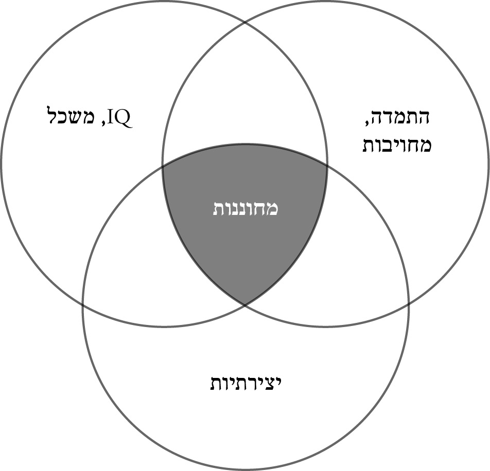 איור 1: שלוש הטבעות — יכולת קוגניטיבית גבוהה, יכולת התמדה בביצוע מטלות עד לסיומן, יצירתיות
